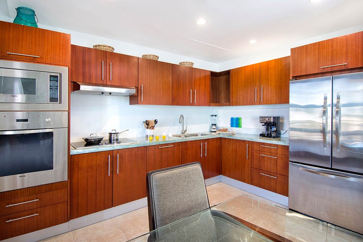 The impeccable kitchen features granite countertops and is equipped with deluxe stainless steel Viking appliances, including a triple door refrigerator, stove, oven, microwave, and dishwasher. Enjoy your meals at the dining area for 4, surrounded by a full supply of china, glasses, and high-quality cookware.
