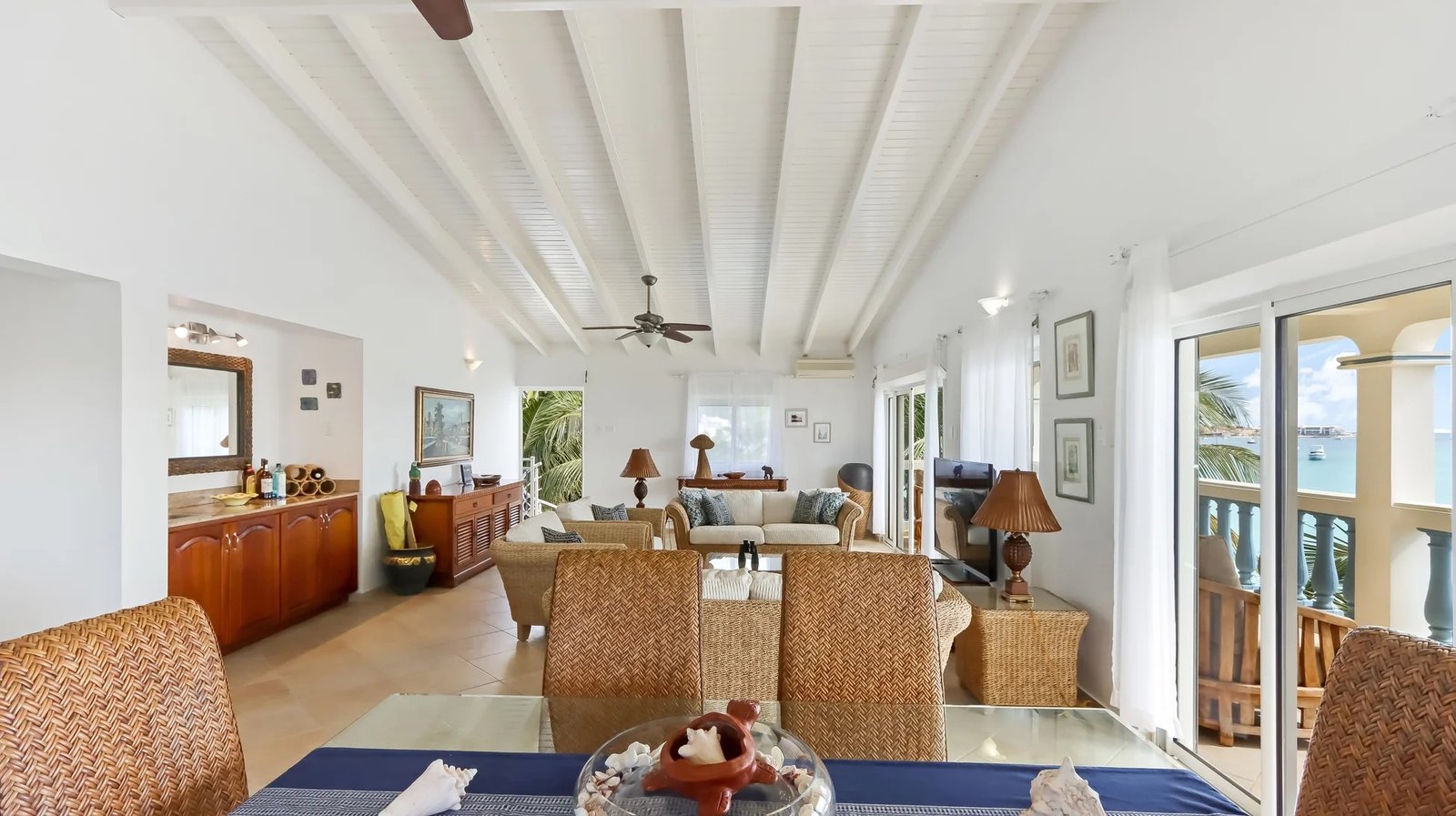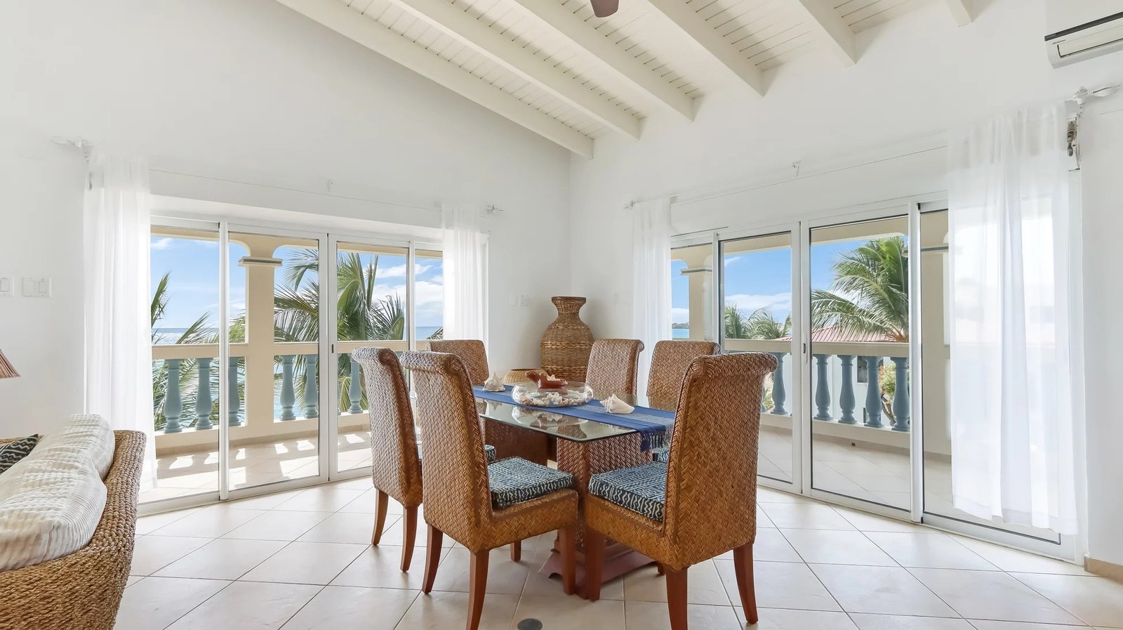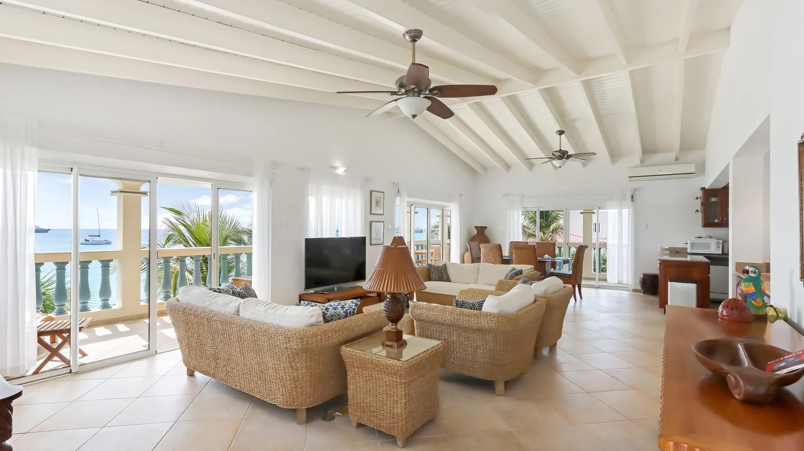 The elegantly furnished living and dining area features a tropical flair. The interior dining table comfortably accommodates six persons, and there’s an additional dining table on the balcony. The wrap-around balcony is furnished with comfortable seating, providing a front-row seat to enjoy the mesmerizing ocean views and sounds, granting you the perfect vantage point for our Caribbean sunsets!