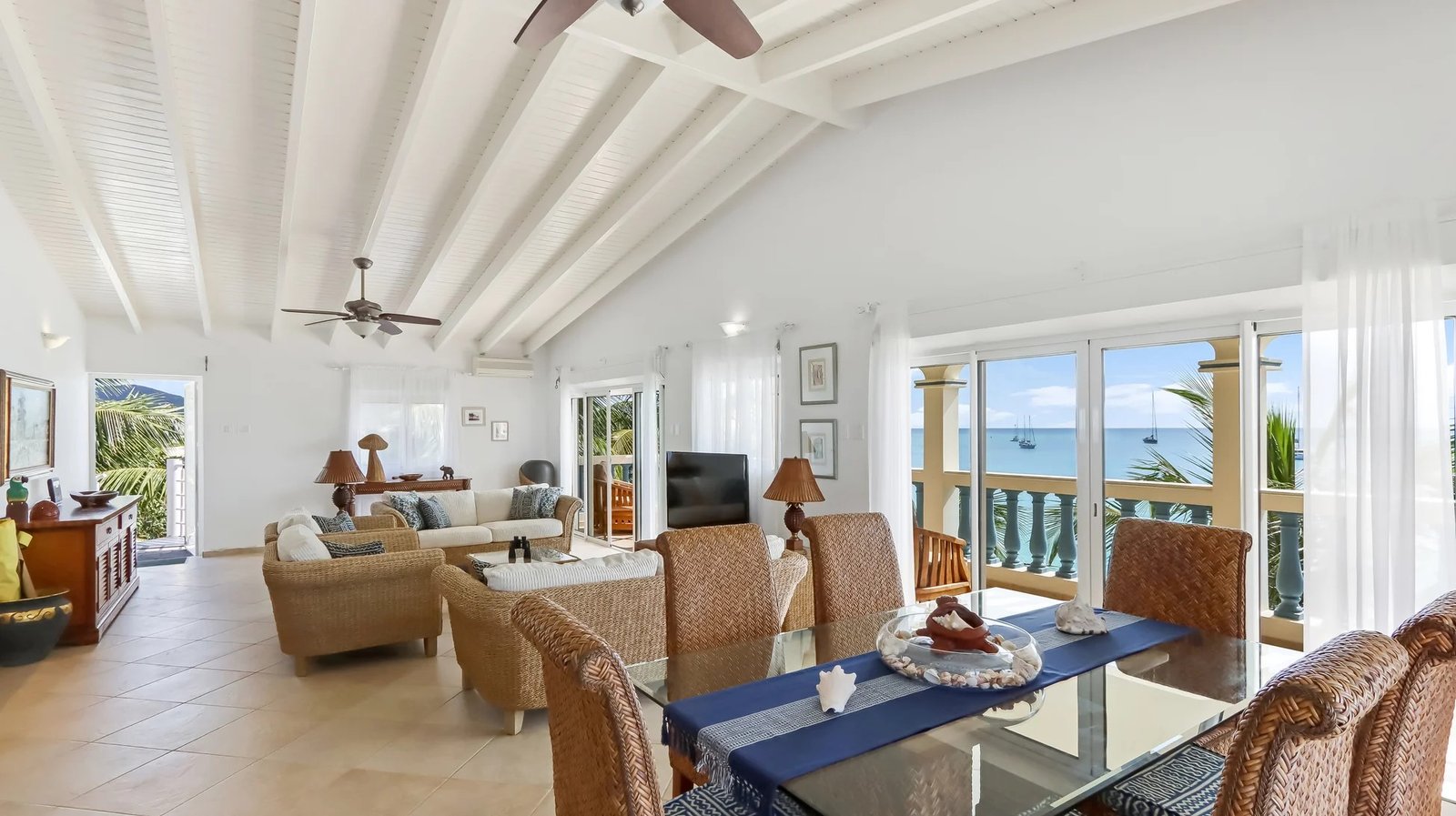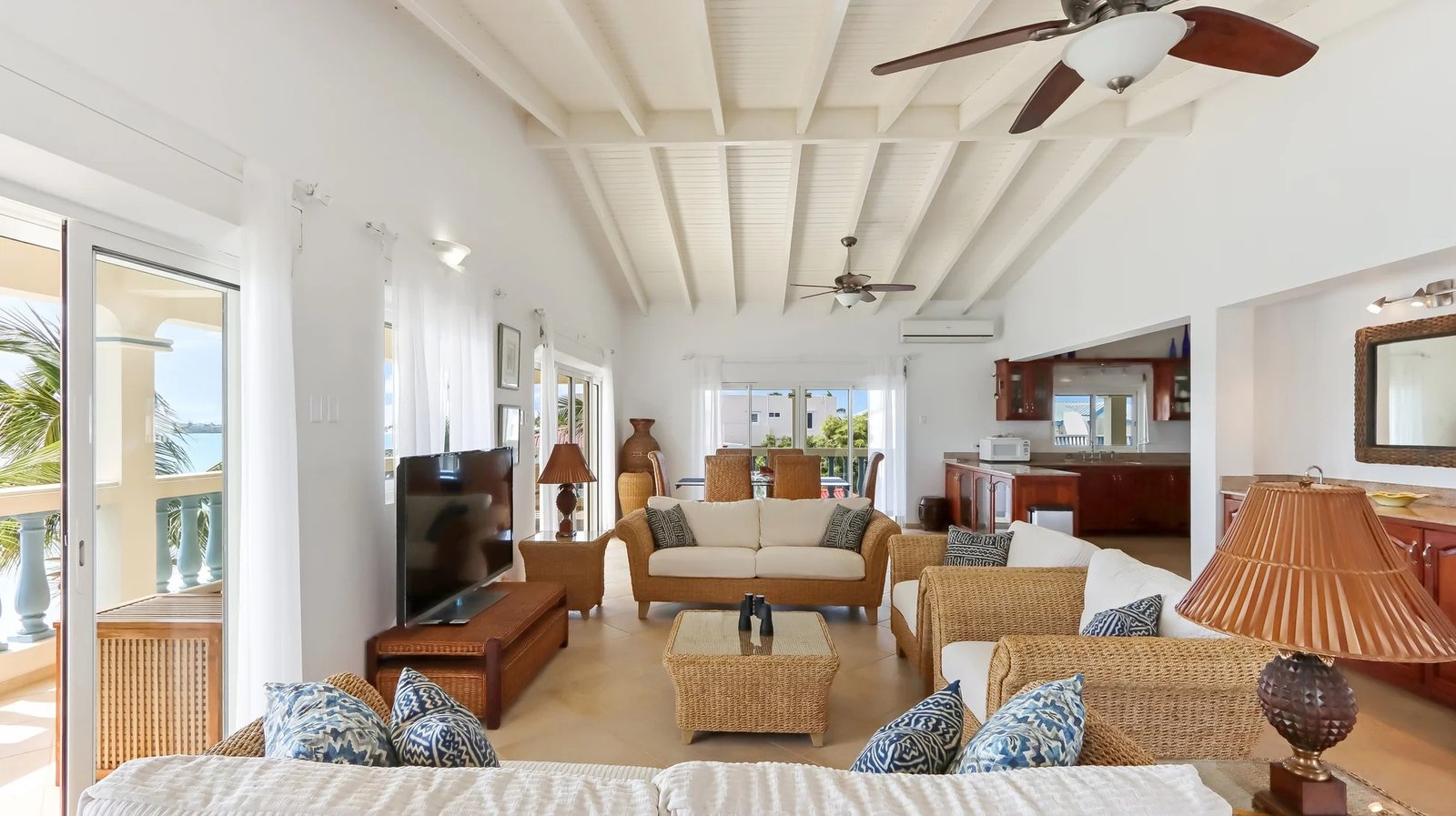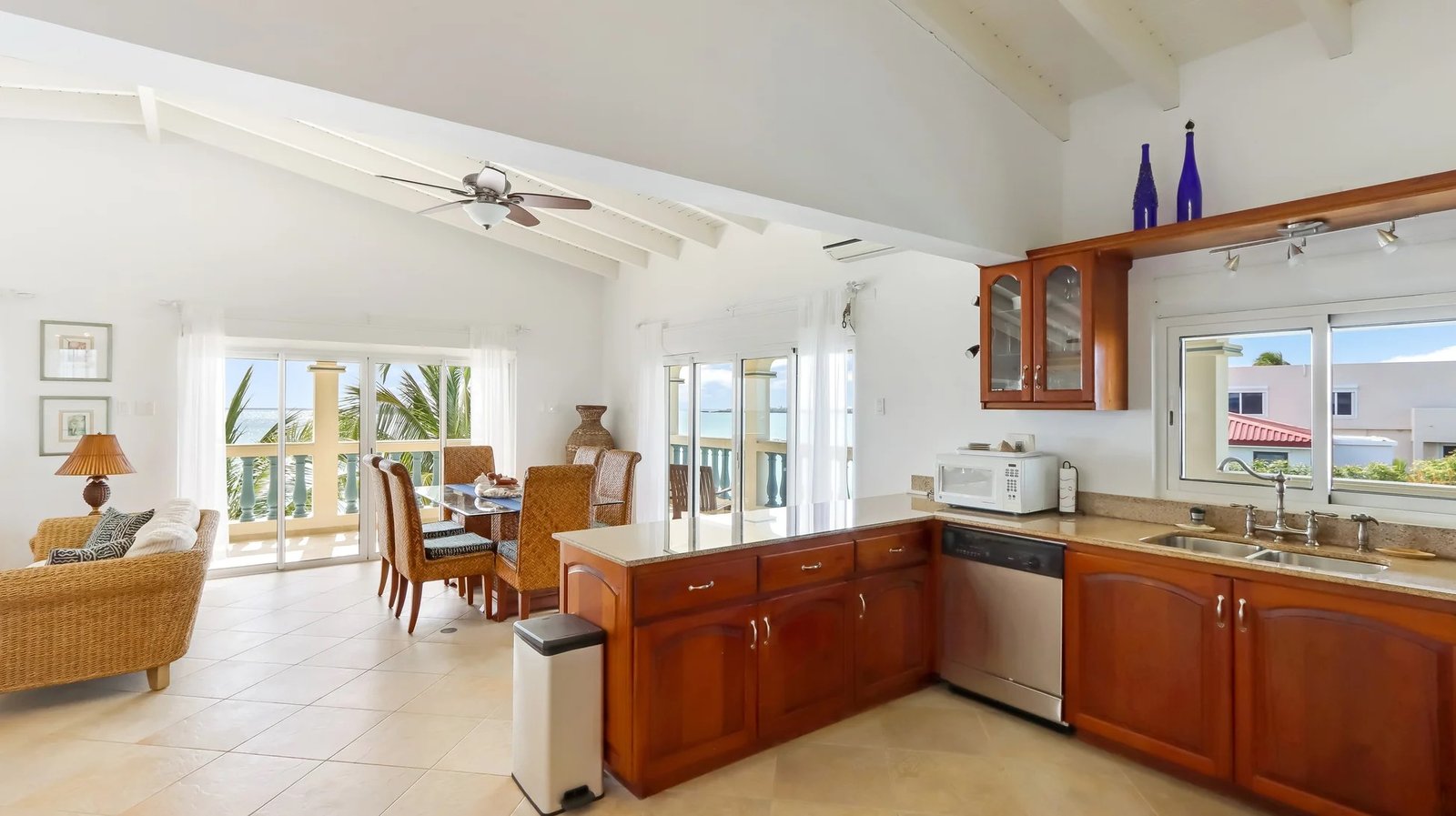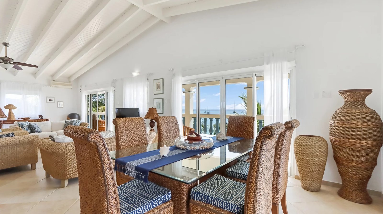 The elegantly furnished living and dining area features a tropical flair. The interior dining table comfortably accommodates six persons, and there’s an additional dining table on the balcony. The wrap-around balcony is furnished with comfortable seating, providing a front-row seat to enjoy the mesmerizing ocean views and sounds, granting you the perfect vantage point for our Caribbean sunsets!