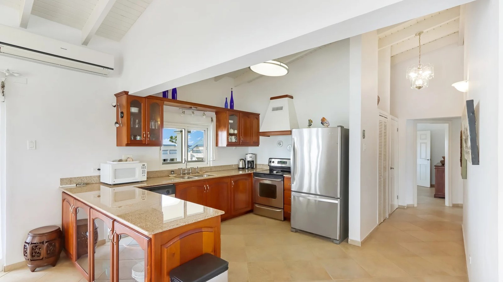 Our well-equipped kitchen boasts ocean views and features granite countertops. Enjoy the convenience of stainless steel appliances, including a refrigerator, stove with oven, microwave, dishwasher, coffee maker, blender, toaster, and a complete array of china, glasses, cooking utensils, crockery, and pots.